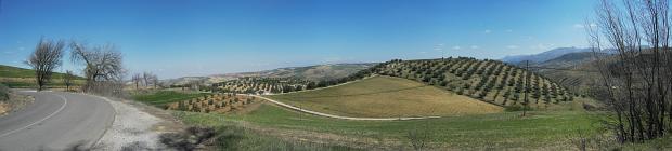 Ausblick auf die Axarquia vom Rio Bermuza aus. | Panorama der "Steppdeckenlandschaft" mit Mandel- und Olivenhainen östlich von Alhama de Granada. |