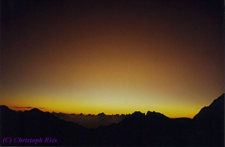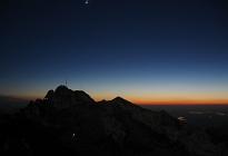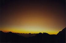 Wendelstein in der Abenddämmerung mit Venus vom Wildalpjochgipfel aus. | Der gleiche Ausblick, aufgenommen 12 Stunden später. | Sonnenuntergang im März 2008, aufgenommen durch ein 400er Tele. |