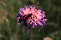 Wunderschöne rote Blume, gesehen im Süden Chiles. | Eine Zebraspinne! Sieht gefährlich aus, ist aber harmlos! | Seltener Schmetterling (Sechsfleck Widderchen) auf Witwenblume. |